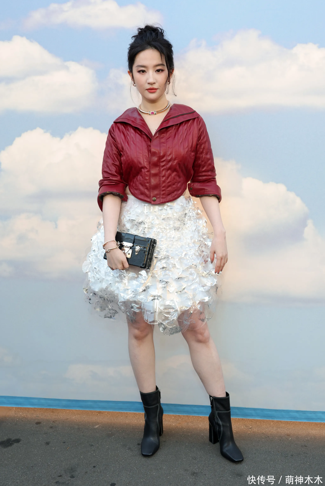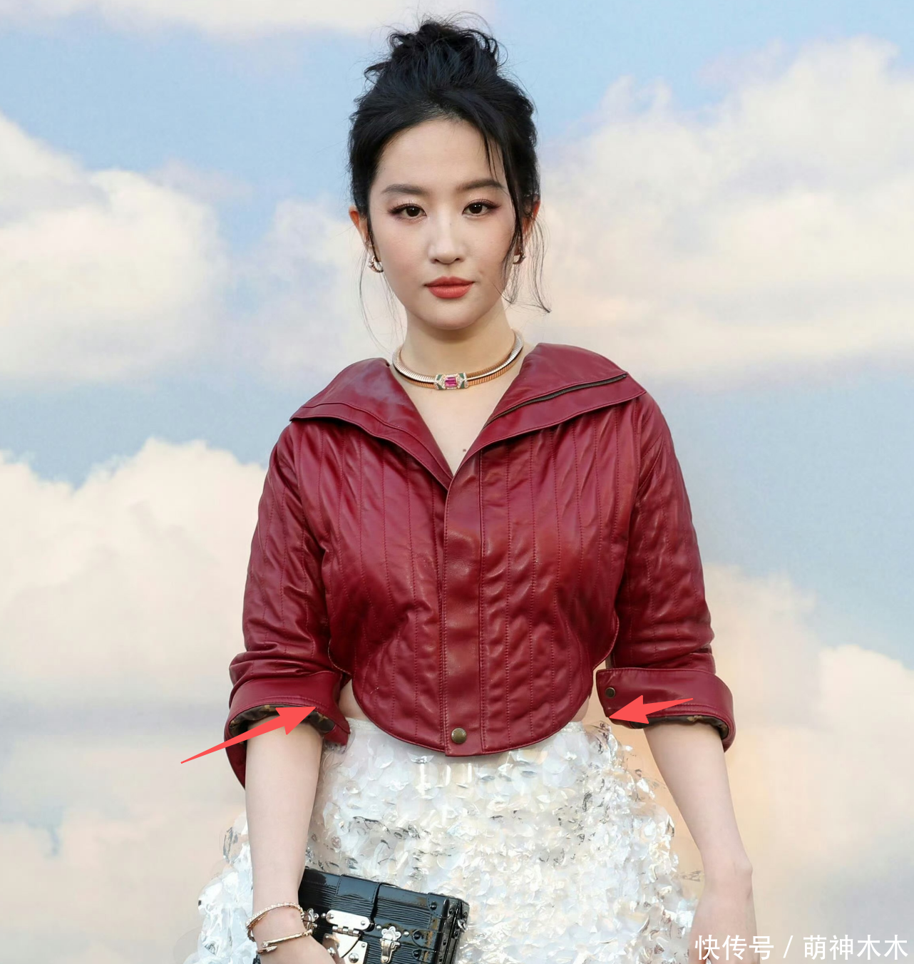 刘亦菲在内娱红毯照上的大直角肩,到了外媒镜头下也变成了溜肩,皮衣的肩线还被领子挡住,导致刘亦菲的生图看上去很壮实,还有点头大身小。