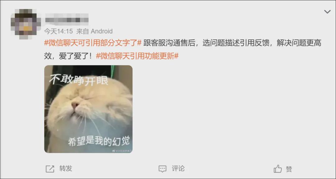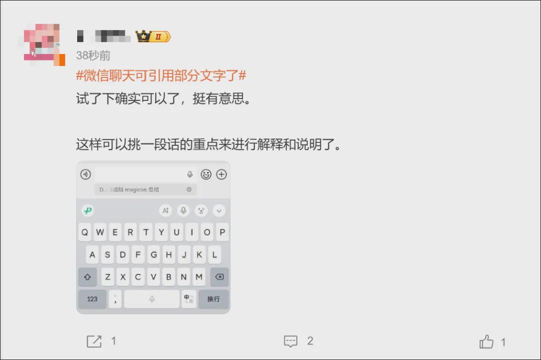 8月14日,微信推出微信聊天引用部分文字功能。很多网友表示已经可以使用。