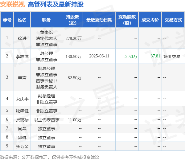 安联锐视的高管列表及最新持股情况如下: